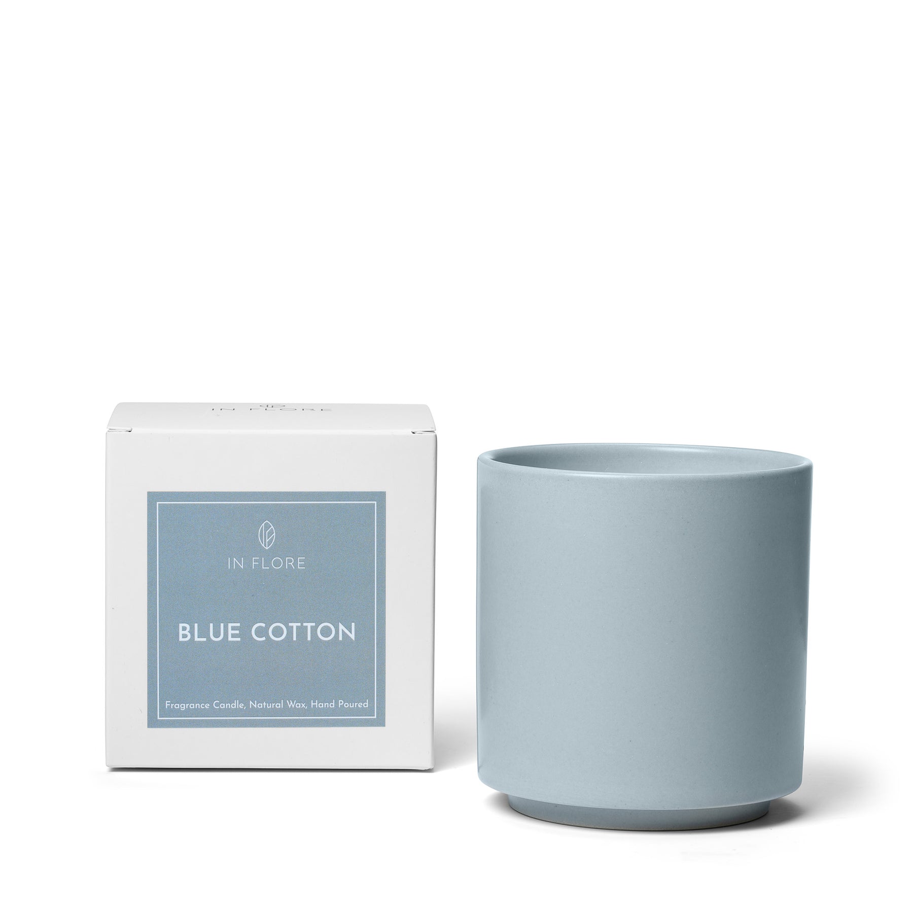Beautiful Estrid scented candle in a soft blue color. The beautiful candle canister is handmade in Sweden in stoneware ceramic. The scented candle is made from natural wax with a double wick in cotton and has a cotton flower scent.