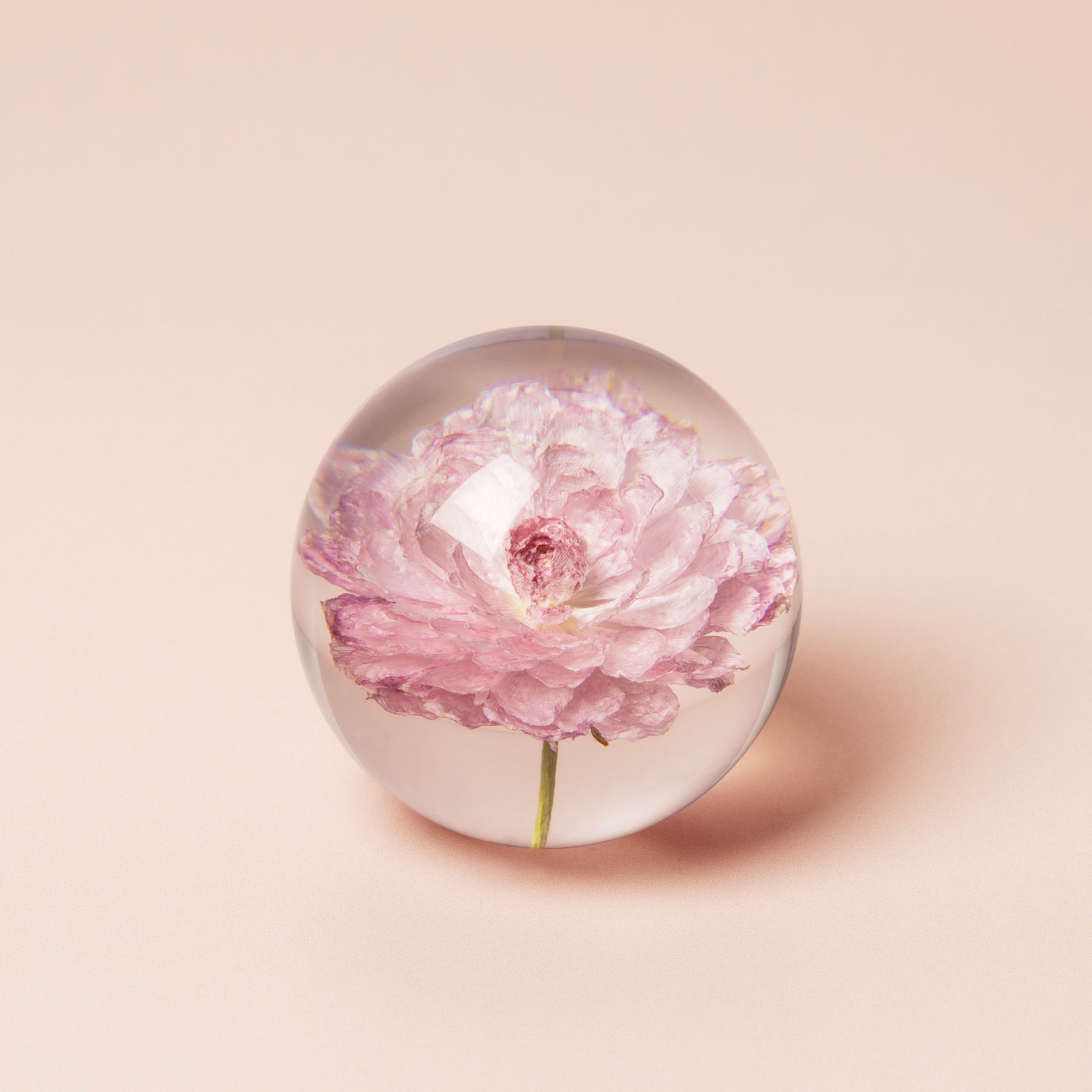 Beautiful In Flore Peony Rose "Ranunculus" paperweight featuring a pink peony rose flower. The paperweight is made from crystal resin with a real ranunculus flower moulded inside.